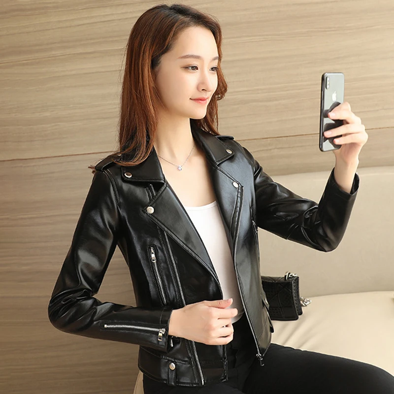 Куртка из искусственной кожи, Женская Черная байкерская мотоциклетная куртка, весна-осень 2021, искусственная кожа, короткая, базовая, корейский стиль, приталенная, женская верхняя одежда