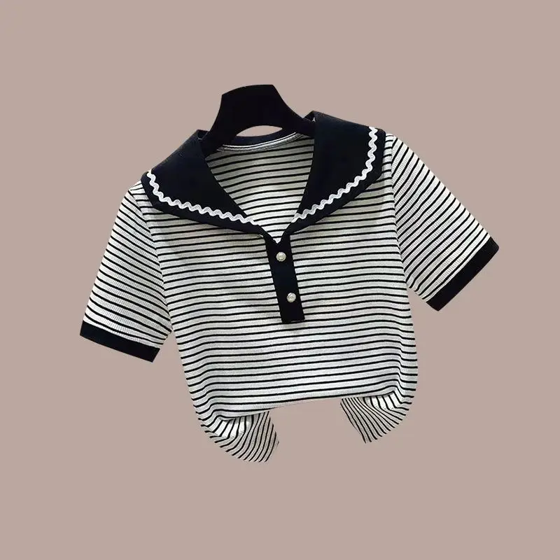 Женская летняя одежда, новинка 2023, нишевая футболка-поло с контрастными короткими рукавами, джинсовая юбка с высокой талией в стиле ретро, комплект из двух предметов