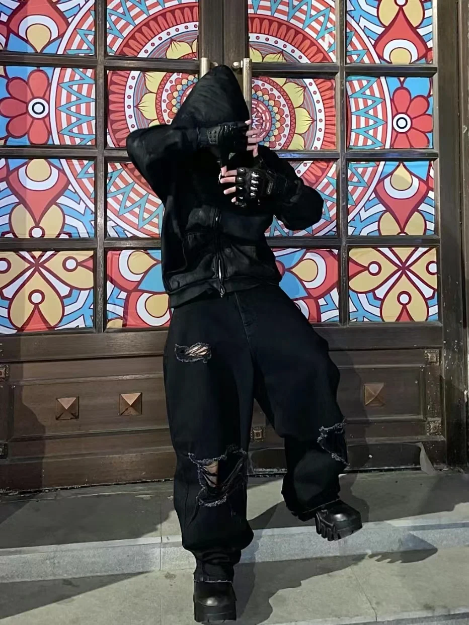 Дизайнерские потертые прямые джинсы, модные рваные брюки с широкими штанинами в стиле High Street, мужские черные брюки, мешковатые джинсы