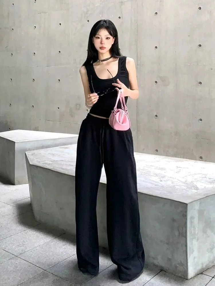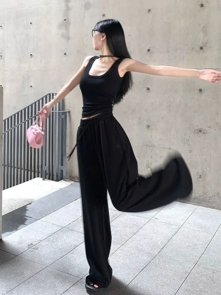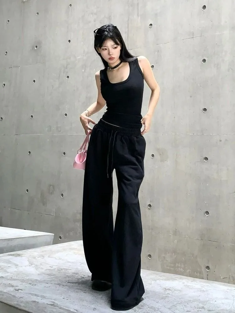 HOUZHOU повседневные черные широкие брюки женские Y2K винтажные спортивные штаны на шнурке для бега осенние однотонные женские брюки для бега оверсайз