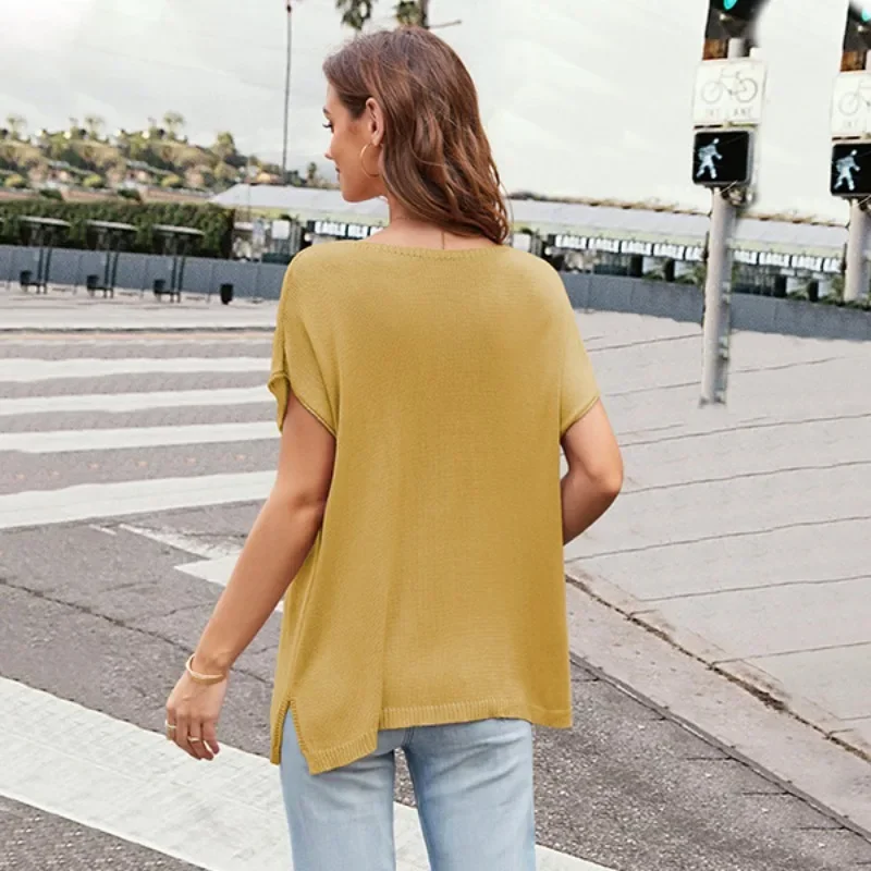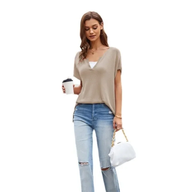 Женская трикотажная рубашка с коротким рукавом и V-образным вырезом