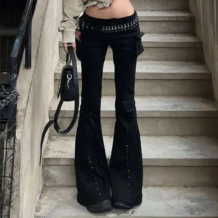 Harajuku Y2K High Street Готический дизайн с заклепками Джинсы-клеш Женские винтажные джинсовые брюки с низкой посадкой 2000-х годов Готические брюки Панталоны