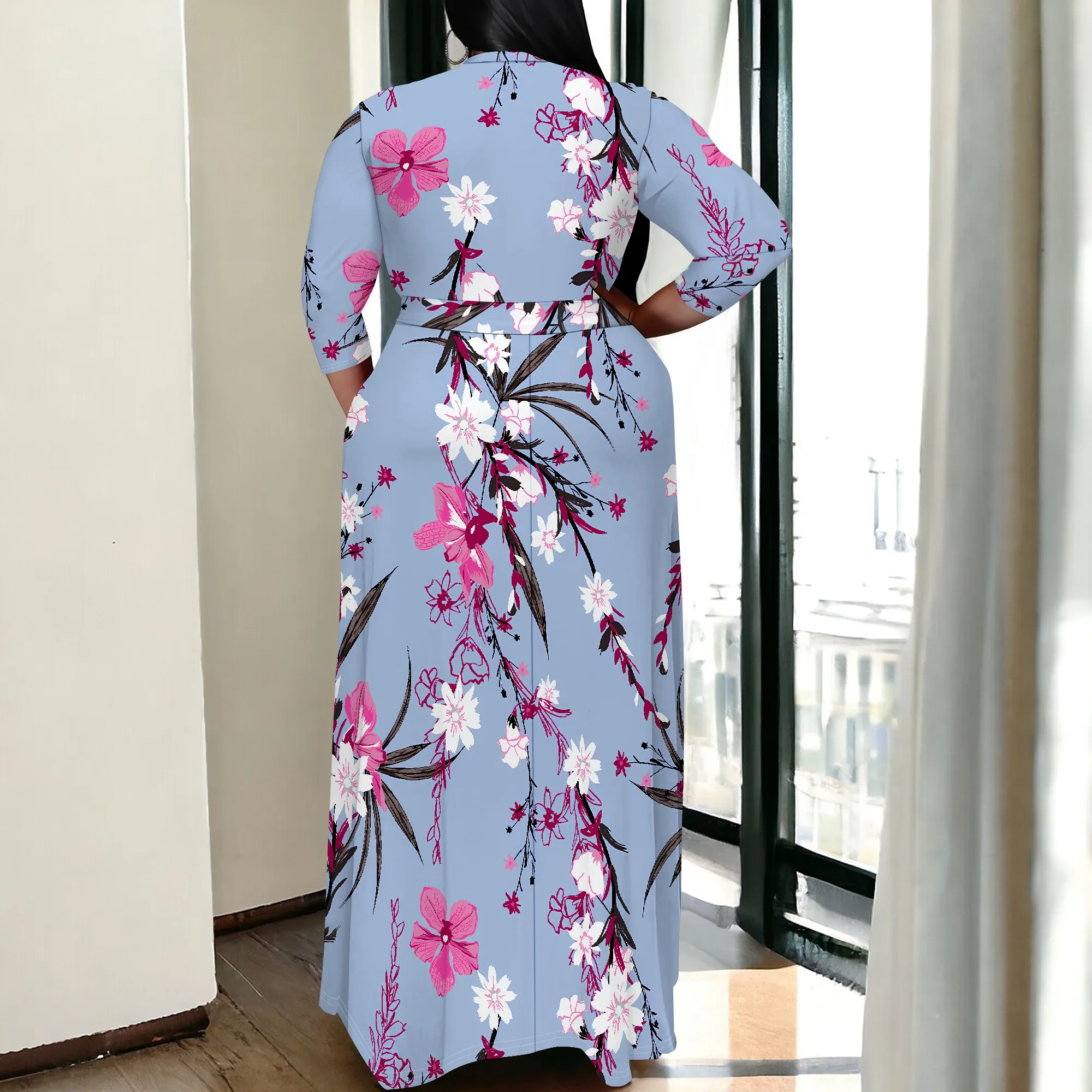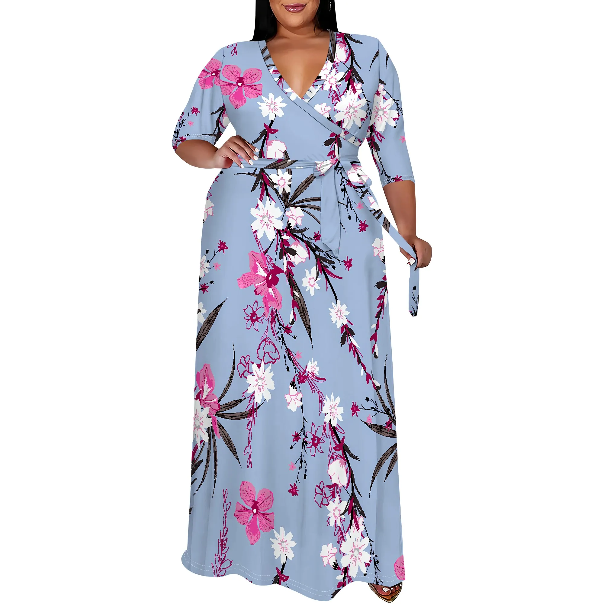 Женское платье больших размеров — женское платье макси с рукавами 3/4 и V-образным вырезом, поясом и карманами