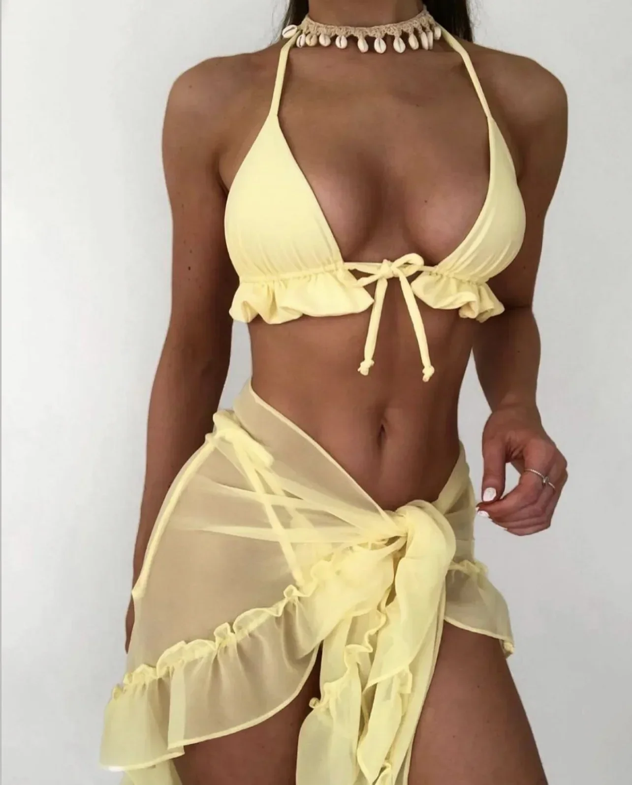 Купальник из 3 предметов, женский желтый комплект бикини с сеткой, 2024, наряд, саронг, купальник, пляжная одежда, купальные костюмы с эффектом пуш-ап, летние ок