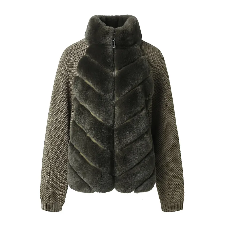 Модное женское толстое теплое зимнее пальто из натурального меха кролика рекс с воротником-стойкой, вязаная куртка с рукавами, женская верхняя одежда