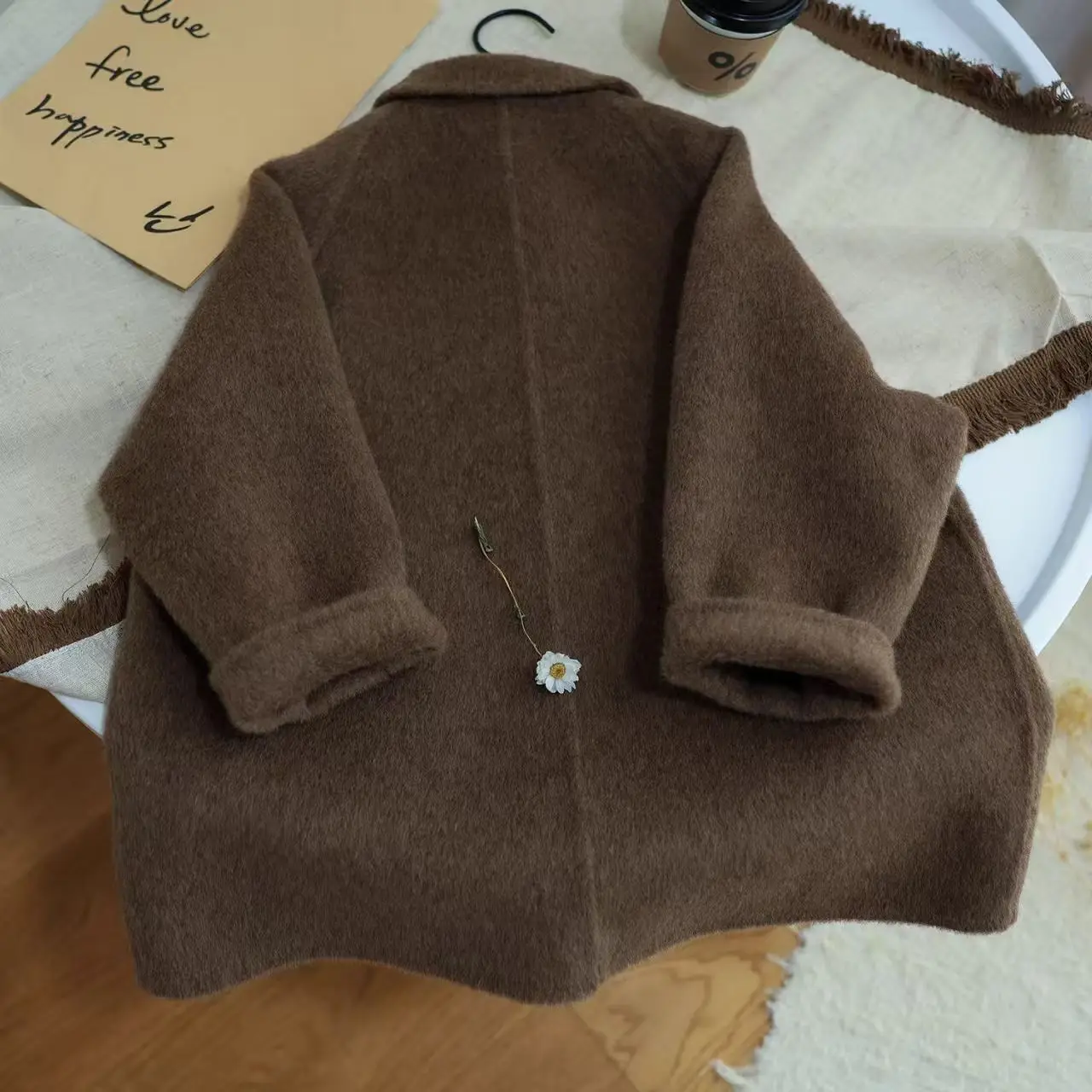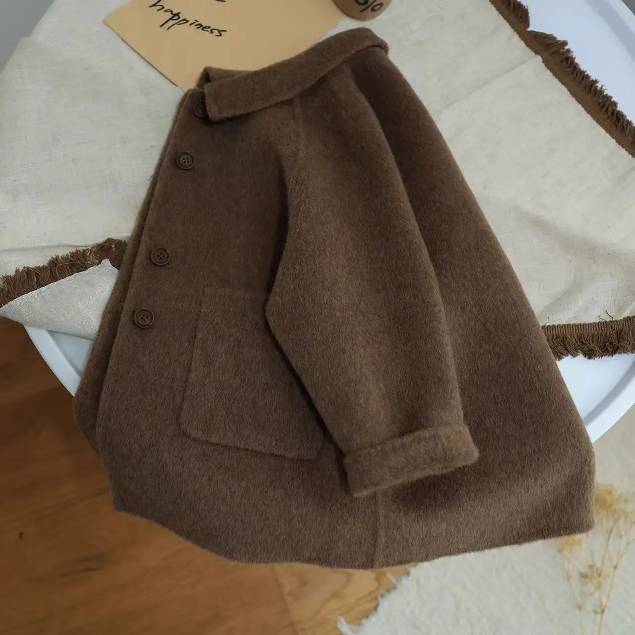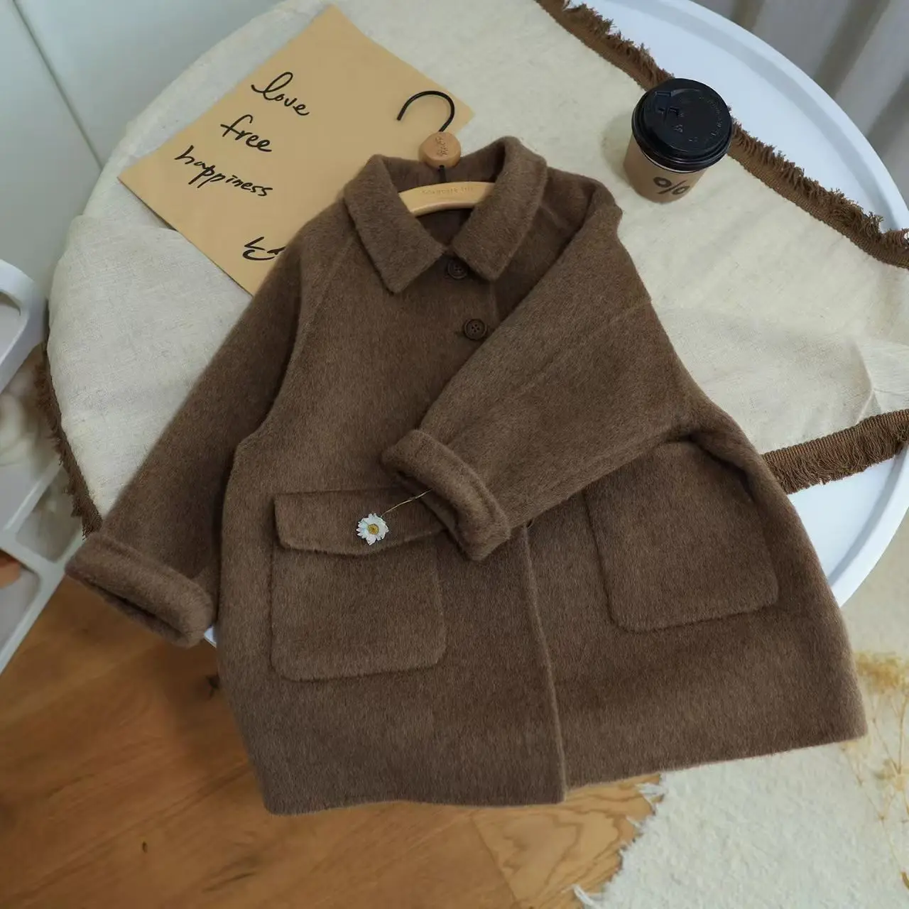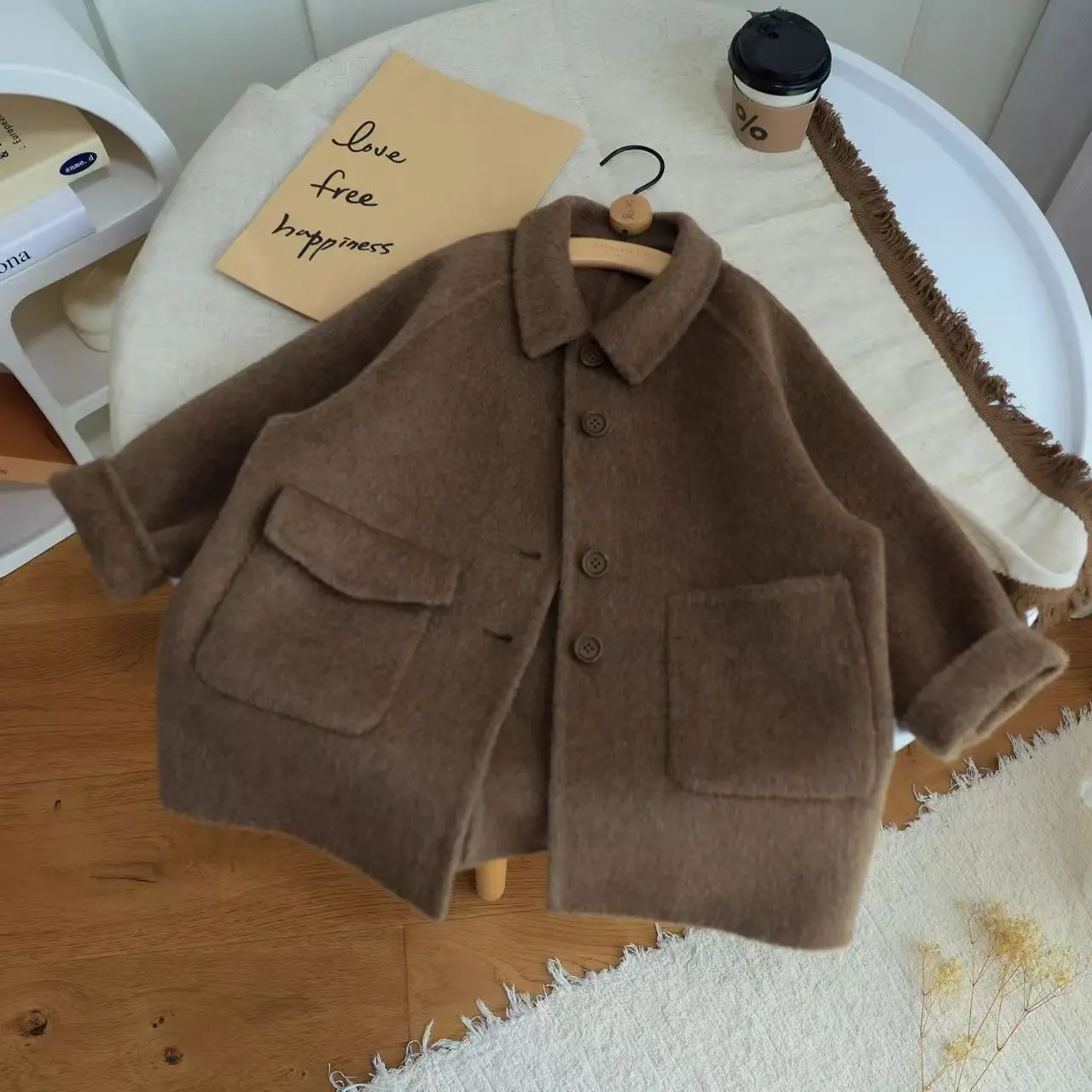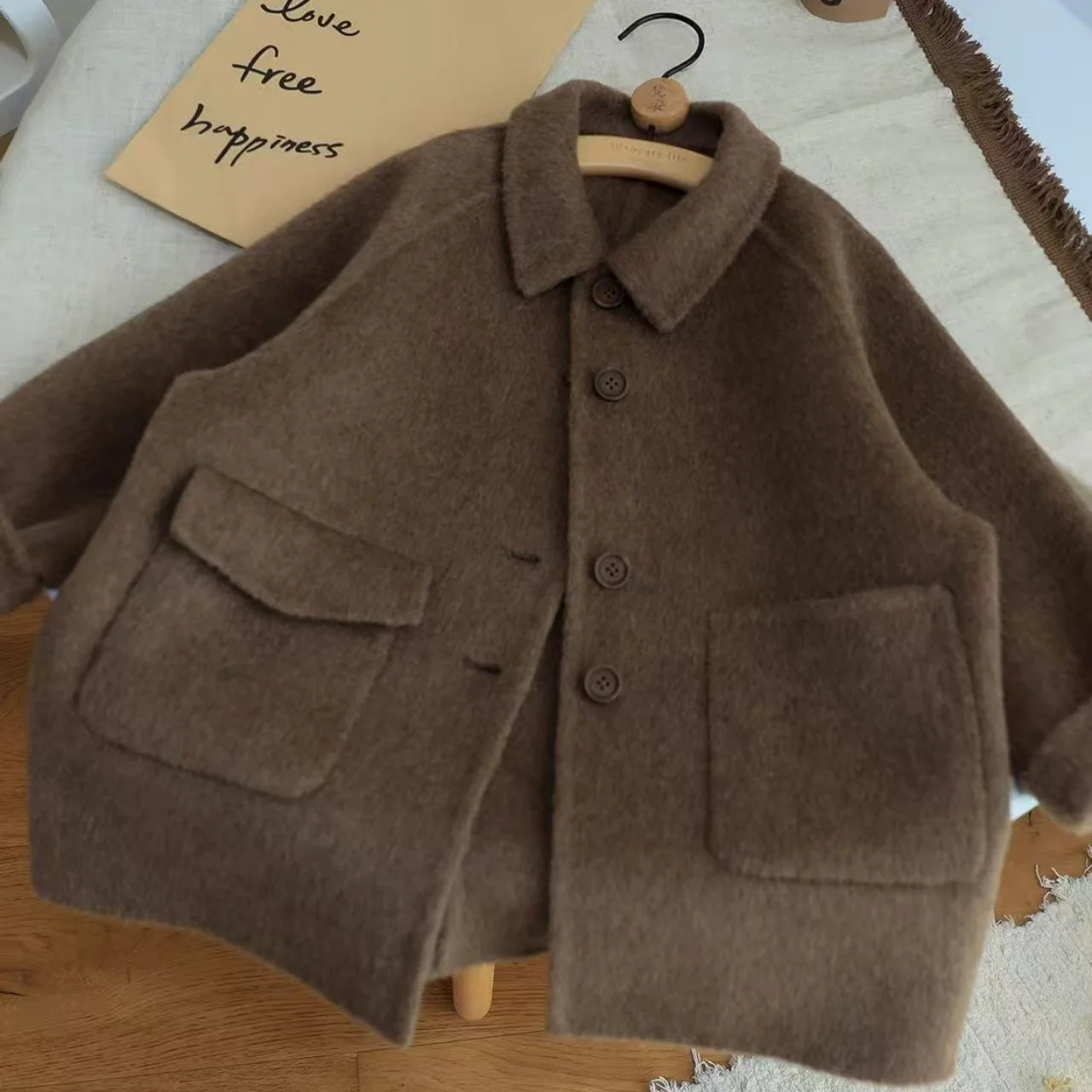 Корейская детская одежда 2026, осенне-зимнее новое шерстяное пальто кофейного цвета в стиле ретро для мальчиков и девочек, пальто в британском стиле